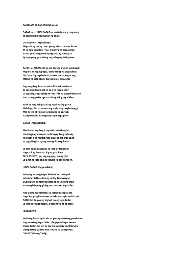 Pangit LAKANDIWA Panimula Malugod na nagpupugay sa balanang nanonood At sa mga nakikinig itong aba ninyong lingkod Sa tagisan ng katwiran ng dalawang magsasalpok Narito ang paksa ngayong sa bayan ay idudulog. O taong Mahal Ka ngunit di mo siya mahal. O taong Maganda ang itsura ngunit pangit ang ugali.